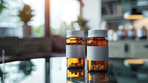 Close-up of two prescription bottles with blank labels on a glass table, modern and clean design, illustration background
