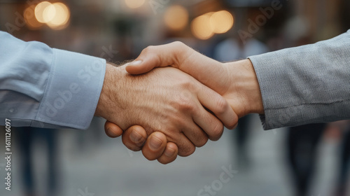 Close-up of two professionals shaking hands in urban setting