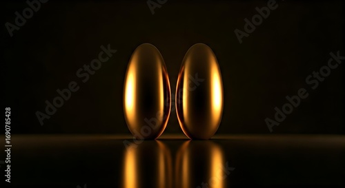 Close-up of two shiny golden eggs standing side by side on a reflective surface against a dark background with warm lighting.