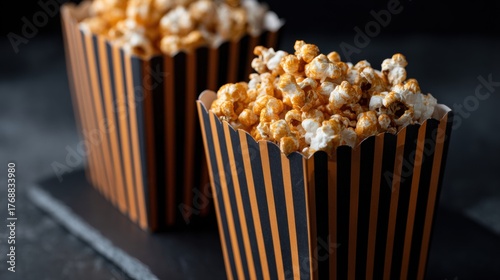Close-up of two striped black and orange containers filled with freshly popped buttered popcorn on a dark background, emphasizing crunchy snack texture and vibrant colors
