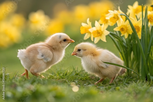 Closeup of two sweet chicks on meadow with blooming daffodils