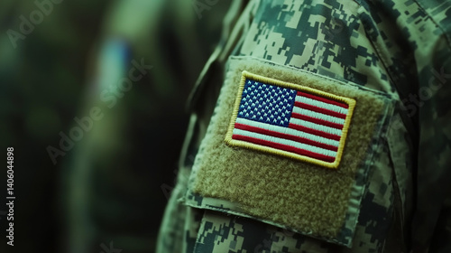 Close-up of U.S. Army uniform with American flag patch and camouflage texture. Tribute for Independence Day, Memorial Day, Flag Day, and Labor Day