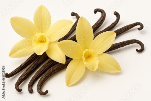 Close-up of vanilla plant parts: flowers and pods, highlighting their aromatic qualities on a white background