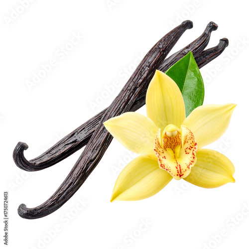 Close-up of vanilla pods, a vibrant yellow flower, and a single green leaf on black
