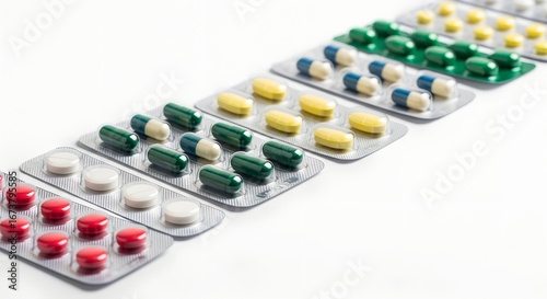 Close-up of various colored pills in blister packs on a white background