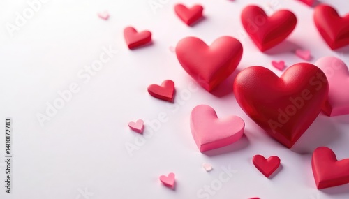 Close-up of various heart shapes, red and pink, on a white background , connection, emotion