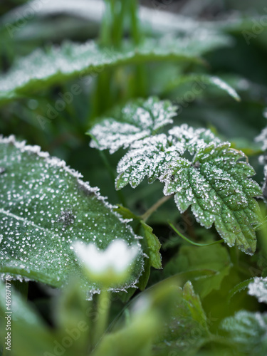 Close-up of various plants covered with hoarfrost. Frost texture on plant leaves. Vertically. Copy space.