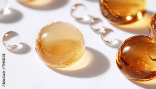 Close-up of various transparent and amber-colored liquid droplets on a white surface, highlighting reflections and smooth textures with soft shadows