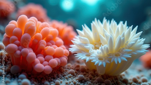 Close-up of vibrant and bleached coral polyps on ocean floor in marine ecosystem