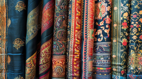 Close-up of vibrant and ornate traditional fabrics, showcasing intricate patterns and rich colors, reflecting cultural artistry.