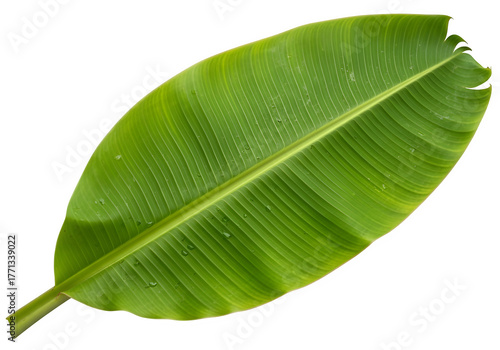 closeup of vibrant green banana leaf, tropical botanical specimen, plant stalk, isolated on white or transparent background. PNG