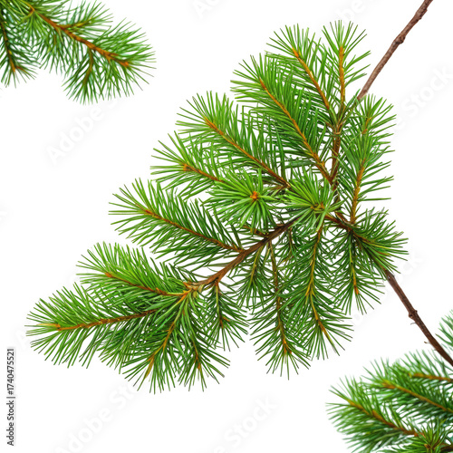 Close-up of vibrant green fir branch on black. Details of needles and structure