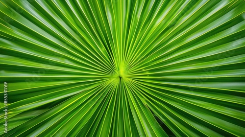 Close-up of vibrant green palm leaf with radiating lines and symmetrical pattern