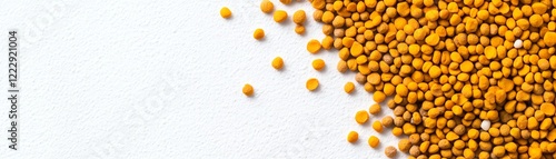 Close-up of vibrant mustard seeds scattered on a white background.