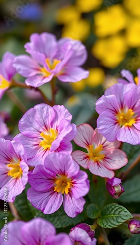 Closeup of Vibrant Purple And Pink Primroses with Yellow Centers