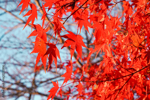 Close-up of vibrant red maple leaves against a bright blue sky, showcasing autumn foliage.