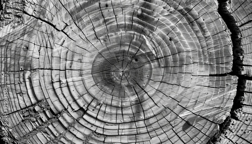 Close-up of warm gray cut wood texture, highlighting detailed black and white organic tree rings