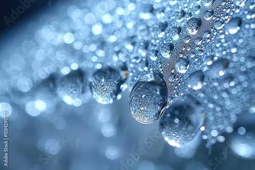 Close-up of water droplets on a surface, illuminated by light, showcasing a multitude of shapes and sizes
