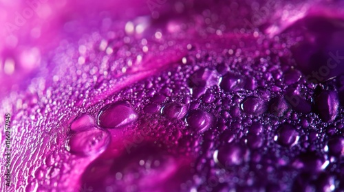 Close-up of water droplets on a vibrant purple surface, showcasing texture and color.