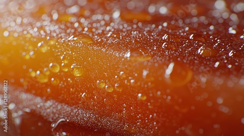 Close-up of water droplets on a warm, orange surface