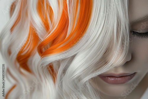 Close-up of wavy, white hair with vibrant orange highlights, showcasing a modern and stylish hair coloring technique.