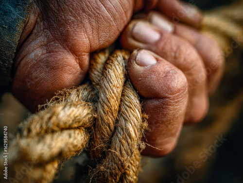 Close-up of weathered hands gripping a thick, frayed rope, highlighting craftsmanship and resilience.