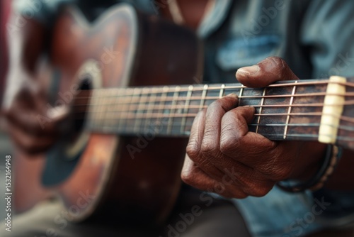 Close-up of weathered hands playing an acoustic guitar, showcasing age, experience, and the passion of music. Perfect for album art, music blogs, and stories about aging musicians.