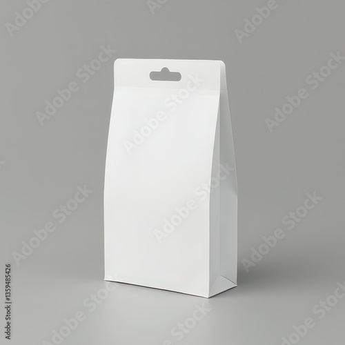 Close-up of white box with hang tab on gray backdrop, upright, soft light, minimal design, branding-ready focus