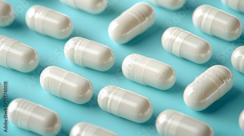 Close-up of white capsules on a blue surface, suggesting medication.