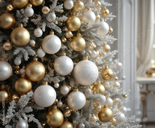 Close-up of white elegant christmas tree with silver and gold ornaments, decoration, elegant