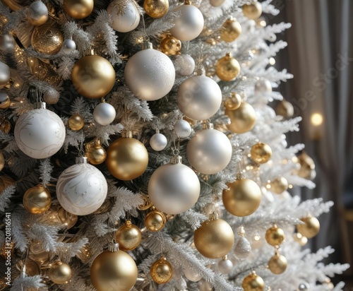 Close-up of white elegant christmas tree with silver and gold ornaments, gold, elegant, festive, ornaments