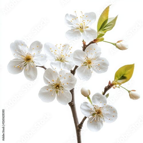 Closeup of white flowers of Prunus cerasoides, also known as Wild Himalayan Cherry on white background