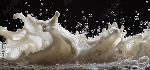 Close-up of white liquid splash with foam and bubbles against a black background.