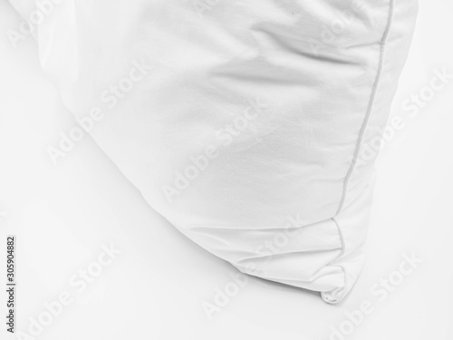 Closeup of white pillow on the bed in the bedroom.
