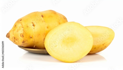 Close-up of whole and sliced yellow potatoes on a white background, perfect for culinary and agricultural themes.