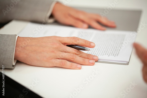 Close-up of woman hands resting on contract while holding a pen