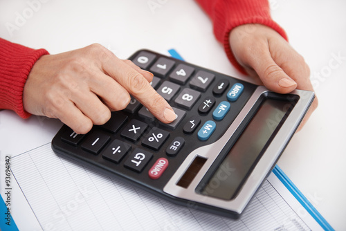 Close-up of woman hands with calculator. Female financial adviser forecasting corporate budget.