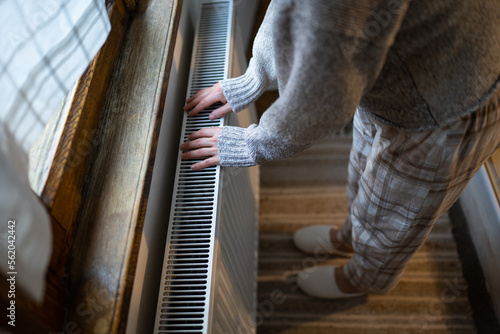 Closeup of woman in woolen sweater wants to keep warmth in apartment. Lady puts hands on room central heating battery to warm up and prevent illness because of coldness. Person checks work of heater