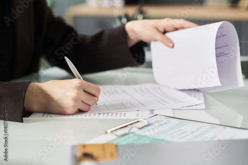 Close-up of woman sitting at table and signing financial contract at meeting