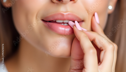 Close-Up of Woman Touching Lips with Pink Nail Polish