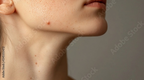 Close-up of Woman's Face and Neck Showing Natural Skin Texture and Moles