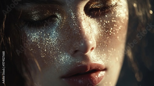 Close-up of woman's face with glitter makeup, eyes closed.