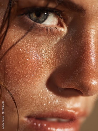 Close-up of woman's face with natural dewy skin texture for skincare and beauty editorial photo campaign