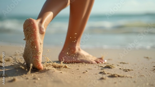 Close-up of Woman's Feet Walking on Sandy Beach, Beautiful Legs in High-Resolution Daylight Photography