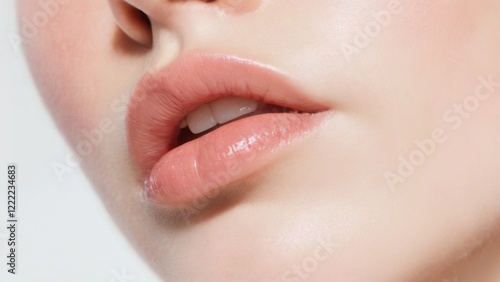 Closeup of woman's full, glossy lips with light pink color, smooth skin, and visible nose, shot from elevated angle on white background.