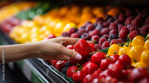 Closeup of woman's hand choosing fruits and berries in supermarket.