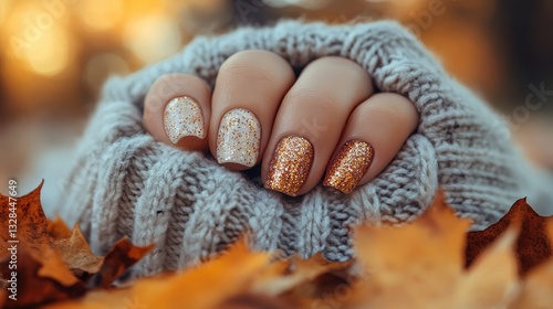 Close-up of woman's hand with glitter nails, nestled in a cozy knitted sweater amidst autumn leaves. Perfect for blogs, websites, or social media promoting fall fashion, beauty, or nail art.