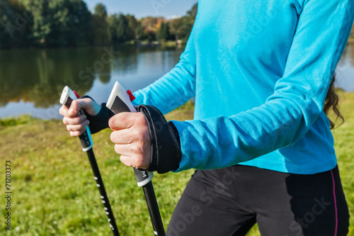 Closeup of woman's hand with nordic walking poles