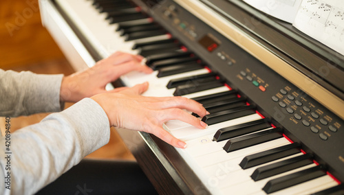 close-up of woman's hands learning to play the electronic piano