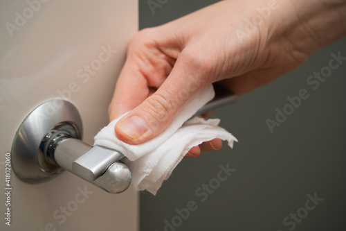Closeup of woman's hands using a wet towel for desinfection of the doors knob. Measures to prevent the epidemic of coronavirus covid-19